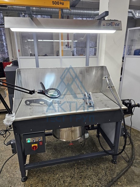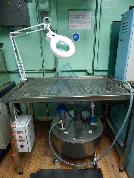 На прошедшей неделе компания "АктивТестГруп" отгрузила заказчику устройство «ЕрМаг СПС-40» для обработки суспензией деталей при проведении магнитопорошкового контроля. Стол для обработки и осмотра деталей имеет следующие габариты: 1350х650х900 мм (ДхШхВ). Стол оснащен баком округлой формы и приводом для удобства перемешивания суспензии (как на водной, так и на масляной основе), а также поддон для сбора суспензии и соленоидом для ее размагничивания. Защитная стенка от возможных брызг суспензии, легкая лейка, светодиодный осветитель, увеличительная лупа с местной подсветкой и ручной УФ-фонарь обеспечивают удобство проведения полива и осмотра деталей, а съемная сетчатая столешница – удобство сервисного обслуживания.